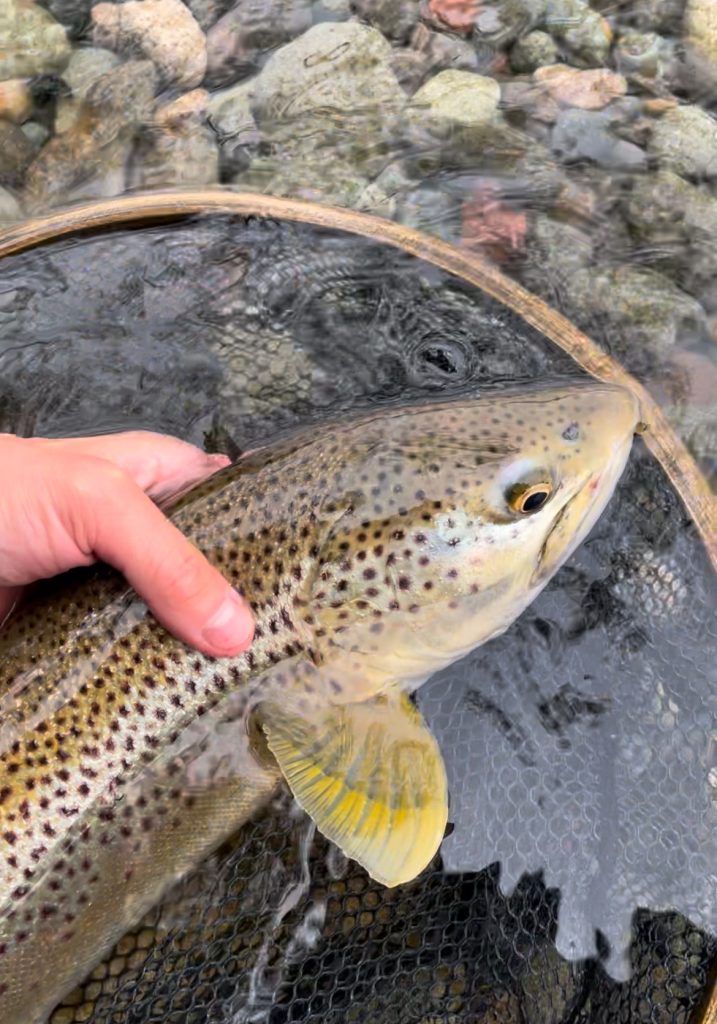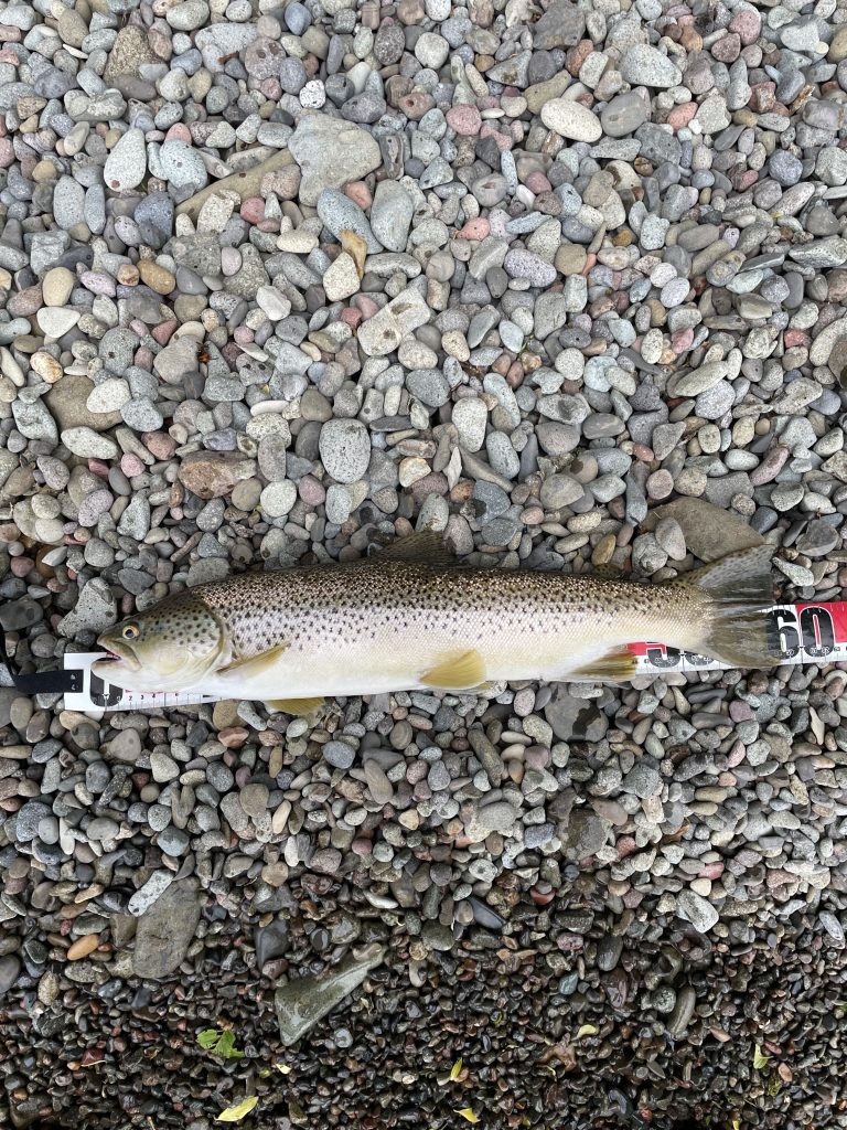 重たい感触が手に伝わる。ロッドの竿先の向きをテンションがかかる方向に変えながらやり取りを続けていると、上がってきた魚はブラウントラウト 58センチであった。
