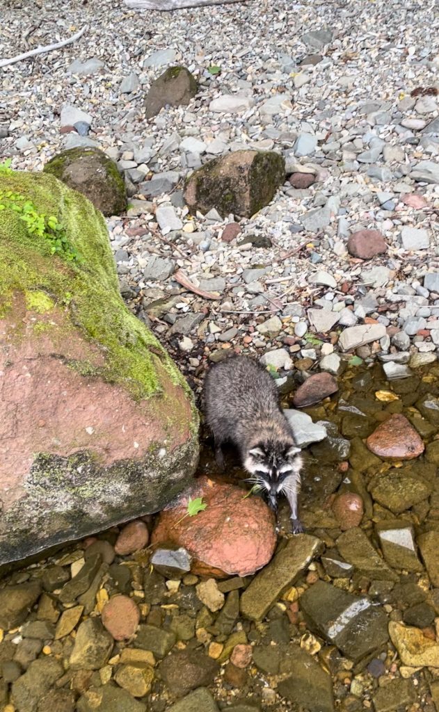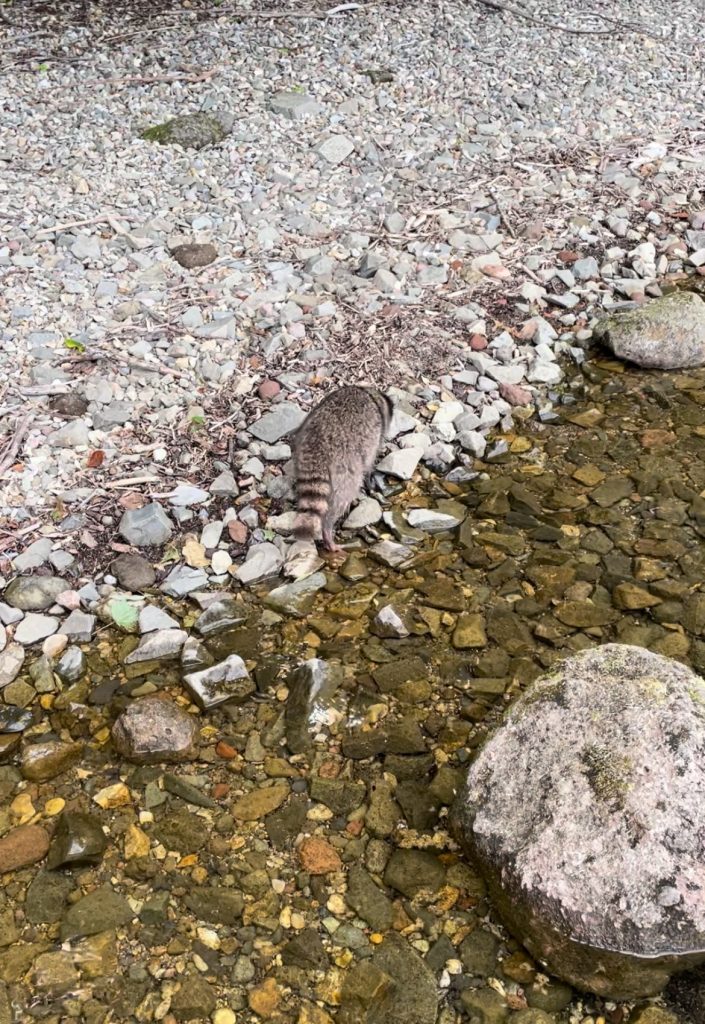 大き目の岩に上って釣りをし、岩から降りようとしたところ足元にエゾタヌキがいた。