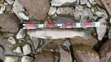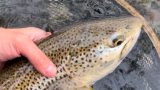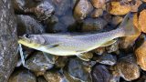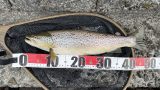 午前10時頃ルアーが駆け上がりの頂点に差し掛かった直後、下から食いあげるようにブラウントラウトがヒットする。